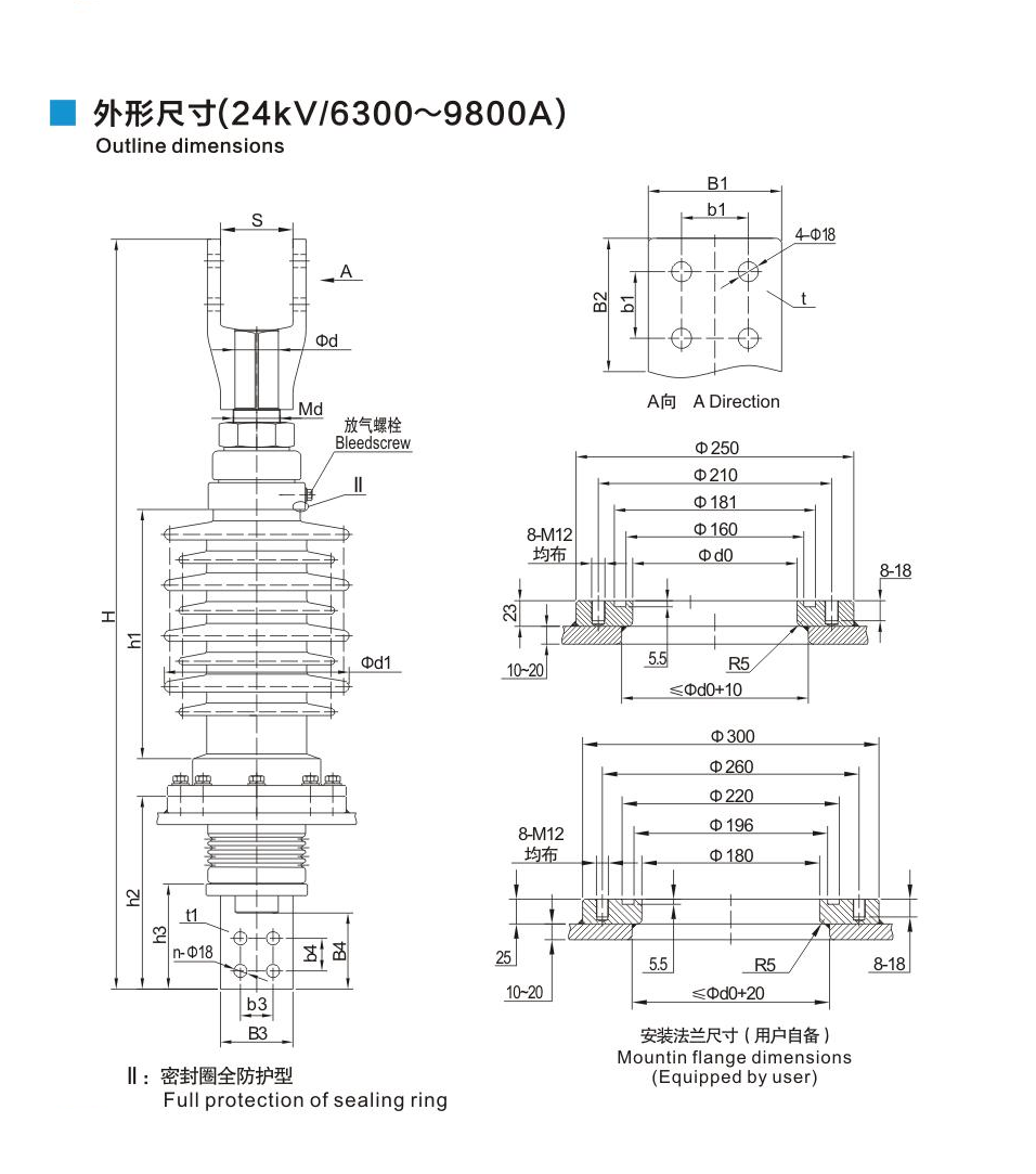 鋁法蘭瓷套管24kV/6300~9800A穿桿式套管