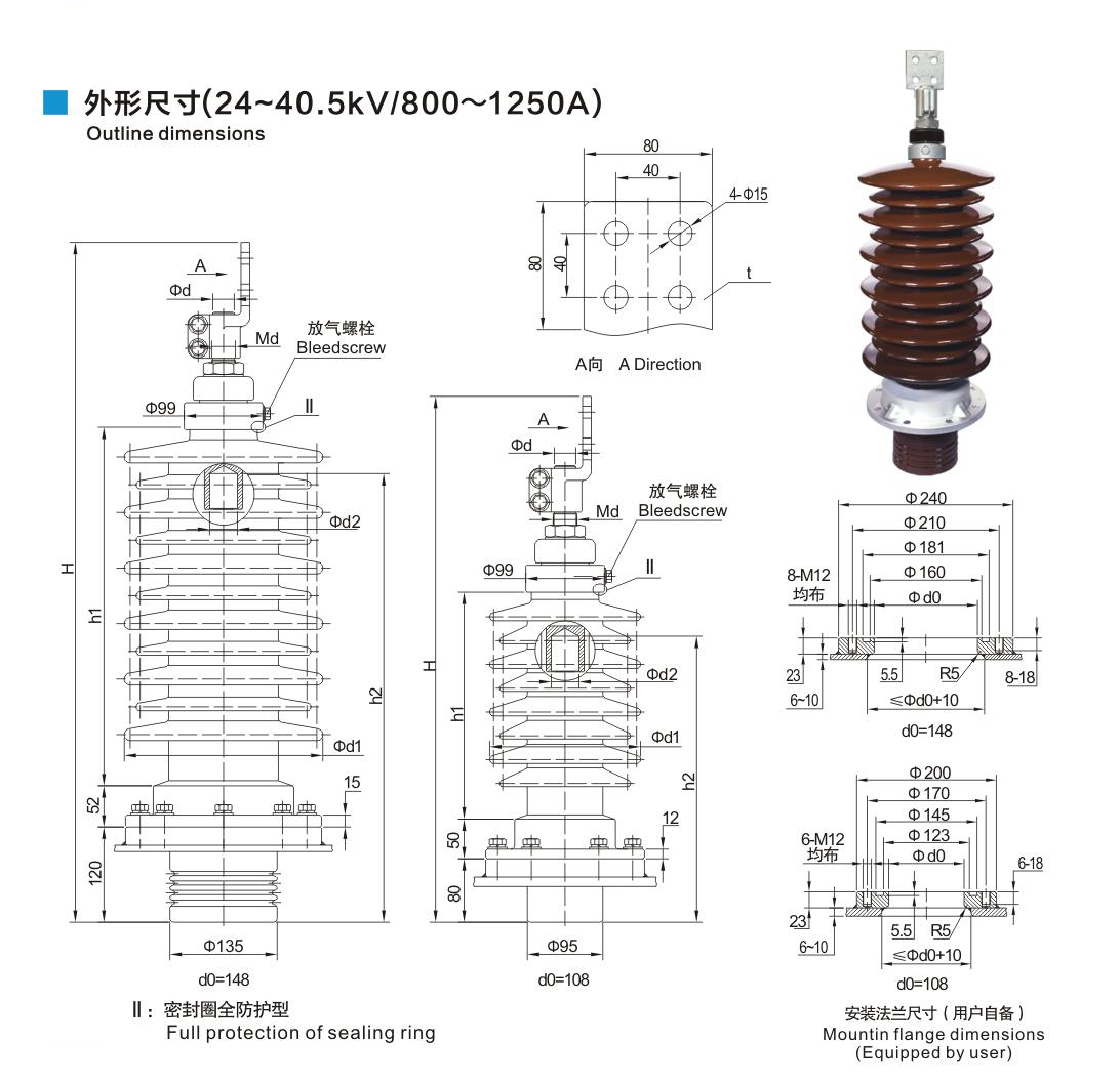 鋁法蘭瓷套管24~40.5kV/800~1250A穿纜式套管